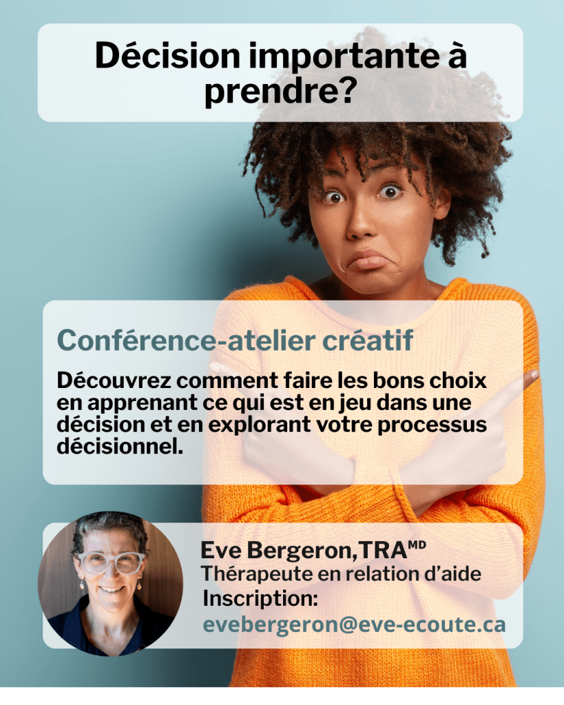 Vous voudriez tenter d’y voir plus clair dans une situation où vous avez une décision importante à prendre? Vous désirez mieux comprendre votre processus décisionnel en vivant une expérience créative? Atelier mêlant enseignements, visualisation et dessin, exposant tout ce qui est en jeu lors d’une prise de décision, vous permettant de choisir avec plus de liberté.