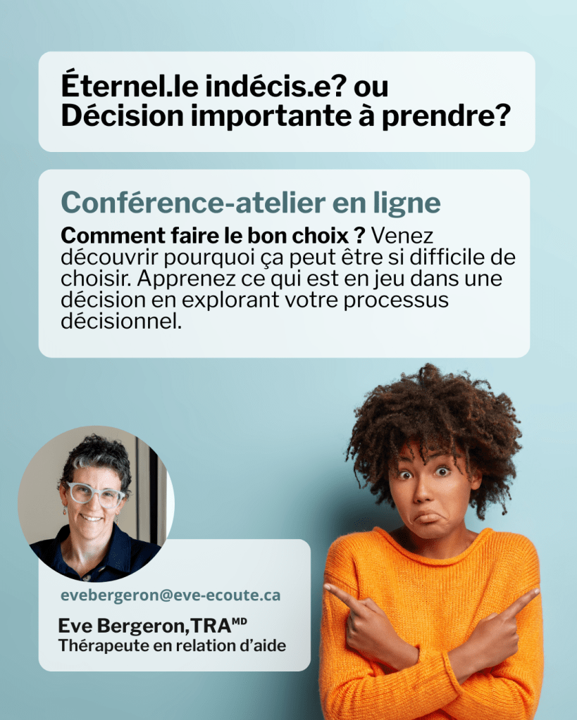 Vous voudriez tenter d’y voir plus clair dans une situation où vous avez une décision importante à prendre? Ou, éternel.le indécis.e, vous désirez mieux comprendre votre processus décisionnel? Cet atelier expose tout ce qui peut être en jeu lors d’une prise de décision, vous permettant de choisir avec plus de liberté.